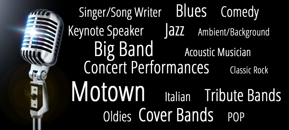 Singer/Song Writer, Blues, Rock, Oldies, Pop, Cover Bands, Tribute Bands Background Music, Ambient Music, Original Music, Jazz, Italian, Concert Performance, Classic Rock, 40s-90s Pop Music, Cover Bands, Magic, Mentalism, Keynote Speakers, Comedy Roasting, Variety Acts, 55 Plus Entertainement, Corporate Events